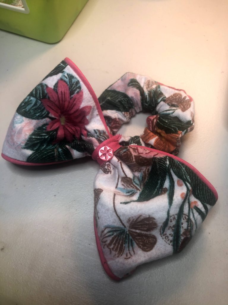 As far as the buttons go, my button foot will also sew buttons on for you but I don’t trust it, lol. I handsewed all 8 on. All 8! It made me wonder how seamstresses who sew all those buttons on the back of a wedding gown do it. Talk about a lot of concentration and hand coordination. I actually finished early in the day so I decided to create a matching scrunchie using the leftover piping and flannel.