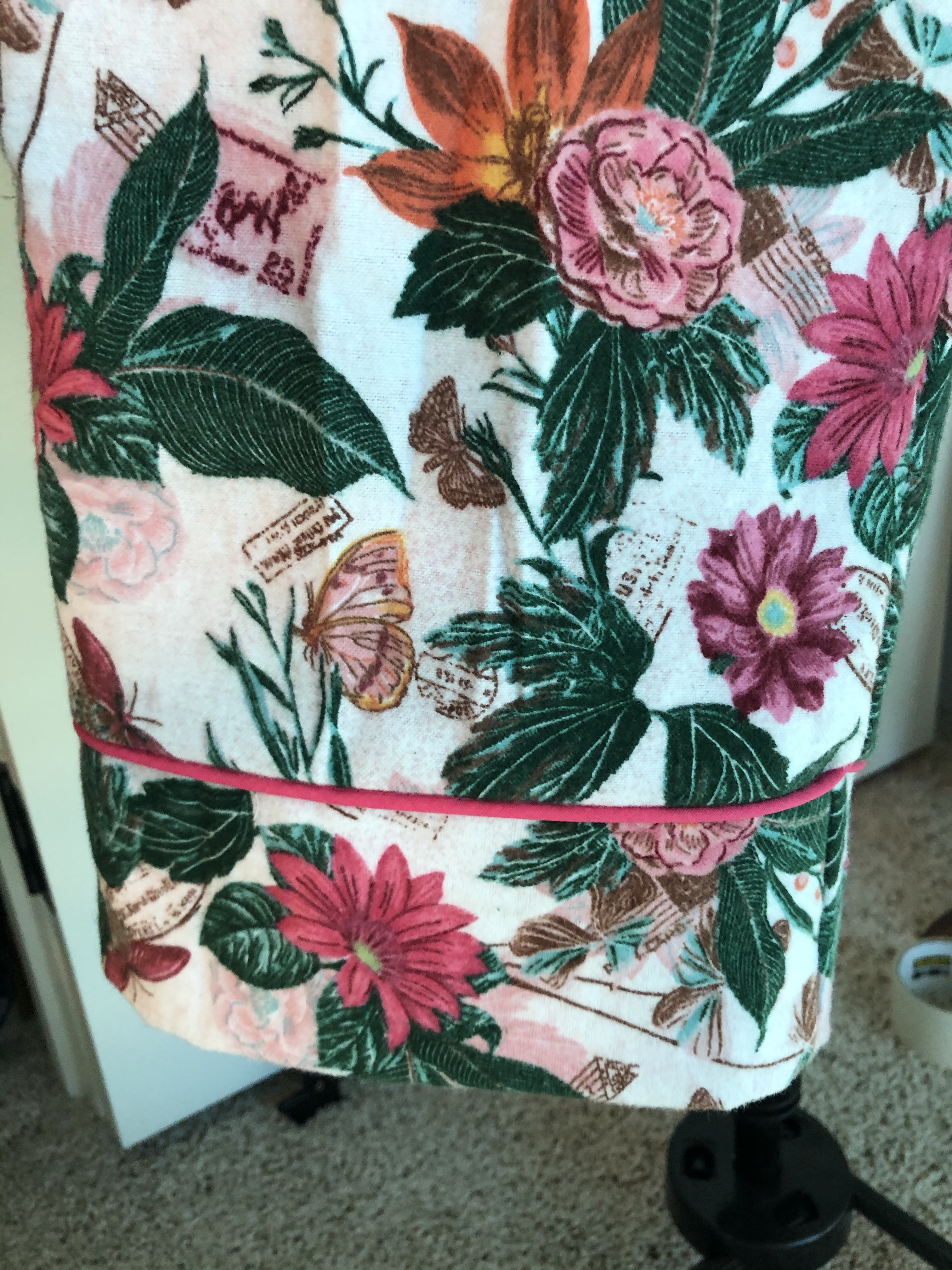 I wear flannels year round but can never find summer flannel pjs in RTW. The stores almost always switch over to shorts and tank tops once summer hits. Flannel seems to be reserved for Christmas for some reason. I chose this bright and happy floral from my fabric stash that I got on super clearance last summer. I just love the hot pink! I decided to highlight that color and use it in the piping and buttons.