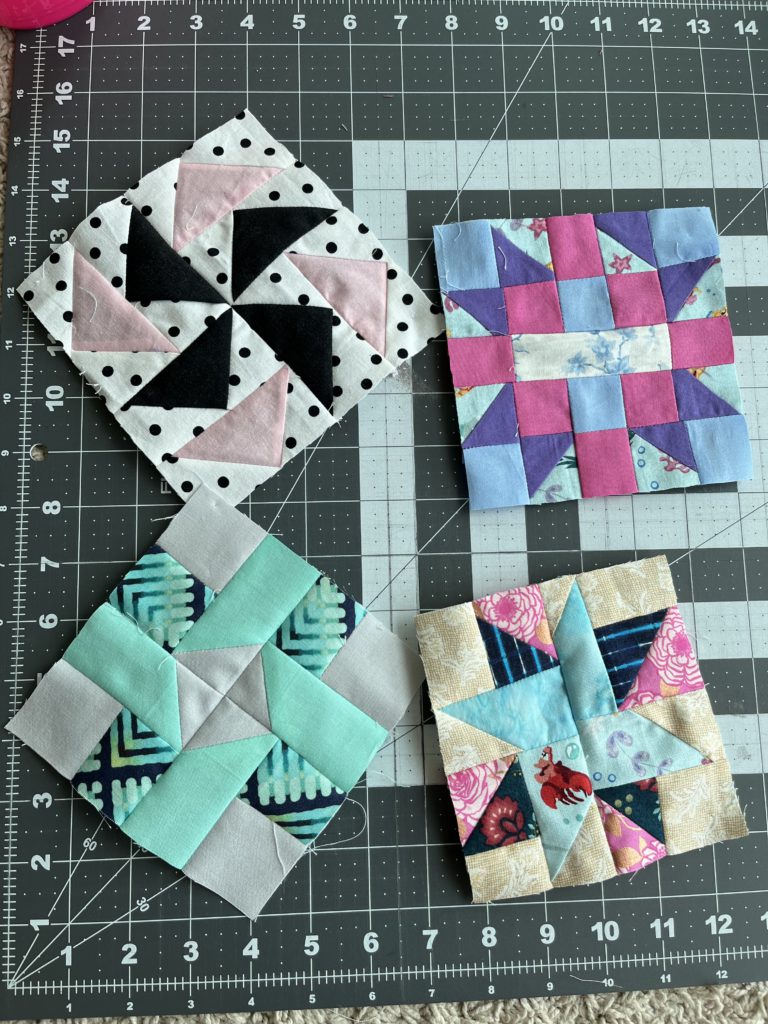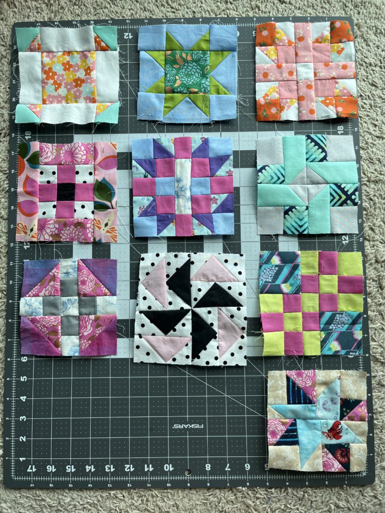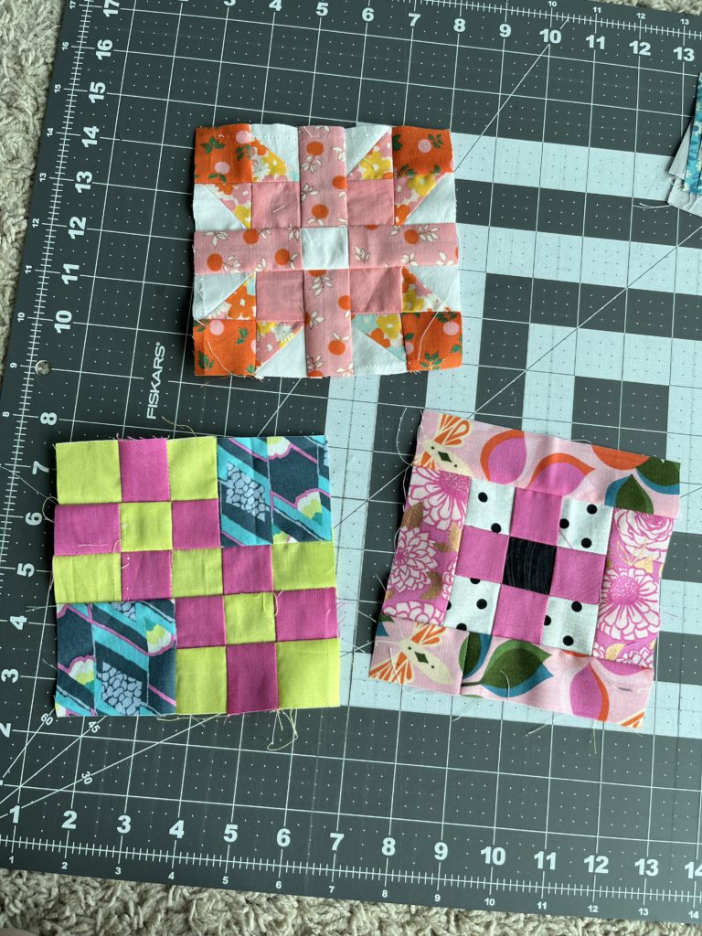 ….which turned into making mini blocks. Funny how having no real plan and having limited materials can get your creative juices flowing. I’m working through the book “Twenty to Stitch Mini Quilt Blocks” by Carolyn Forster. Each block finishes at 5″ square.