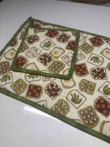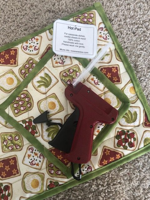 To make things extra special for my DIY gifts I decided to make some gift tags. I also didn’t want anyone to confuse the large hot pad for a placemat and wonder where the other 5 place settings were. Lol, you just never know! The last thing I want is someone to open their gift and be like “What the heck is this??!” I whipped up a label on Microsoft Word and printed on cardstock. I decided to invest in a plastic tag gun to put them together so they wouldn’t jostle around in the box. This totally makes it look more legit, like it came from the store, lol. For me the ultimate compliment for my sewing is when someone says, “You made this?! I thought you bought it.”