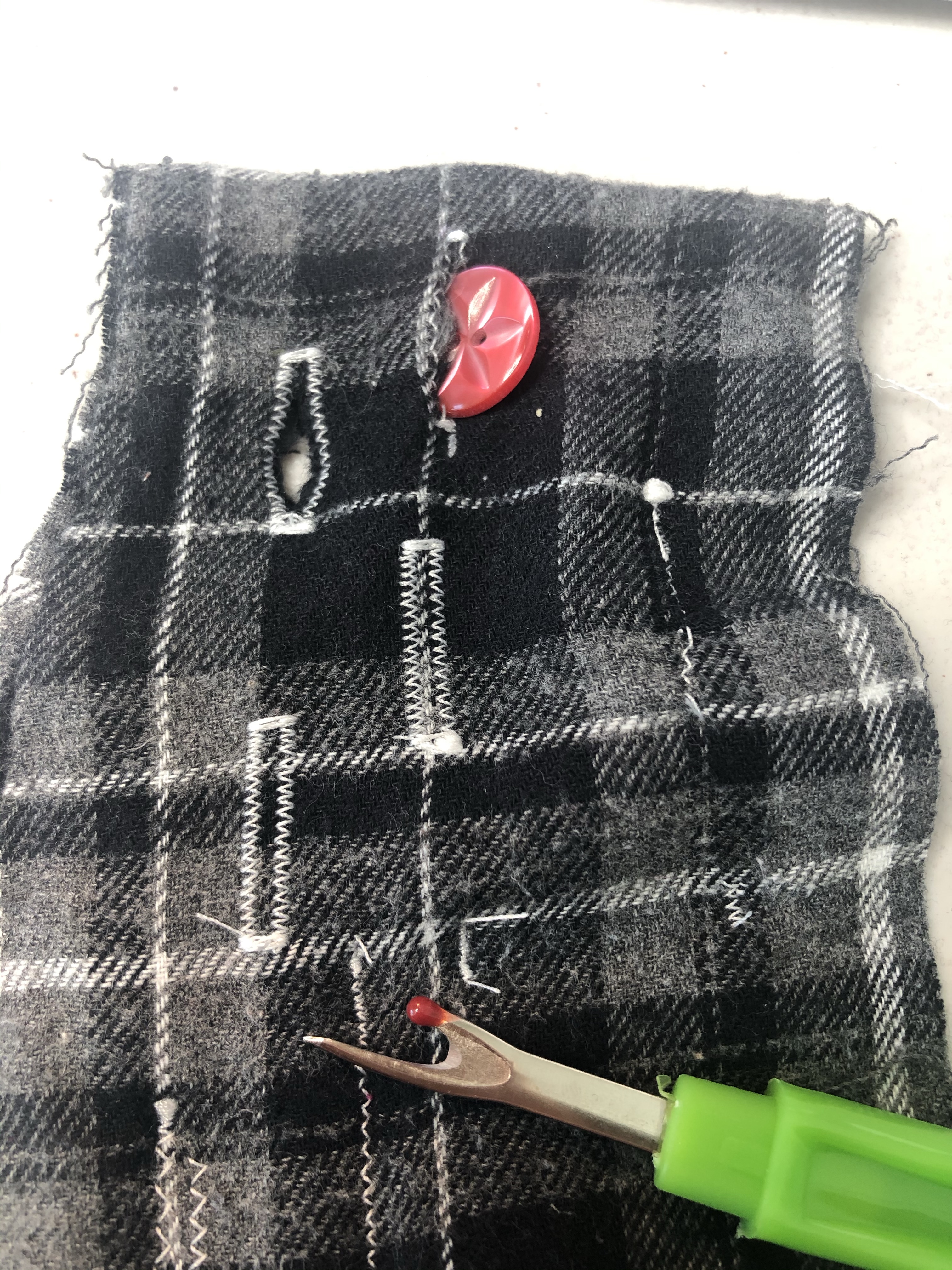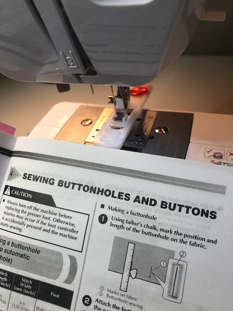 Day 5: BUTTON day. I knew it was coming and I couldn’t sleep the night before. I was going to learn how to sew this buttonhole no matter what. My sewing machine has a buttonhole foot so I busted out the manual and practiced the heck out of it on a scrap piece of flannel. I even practiced slicing open the hole.