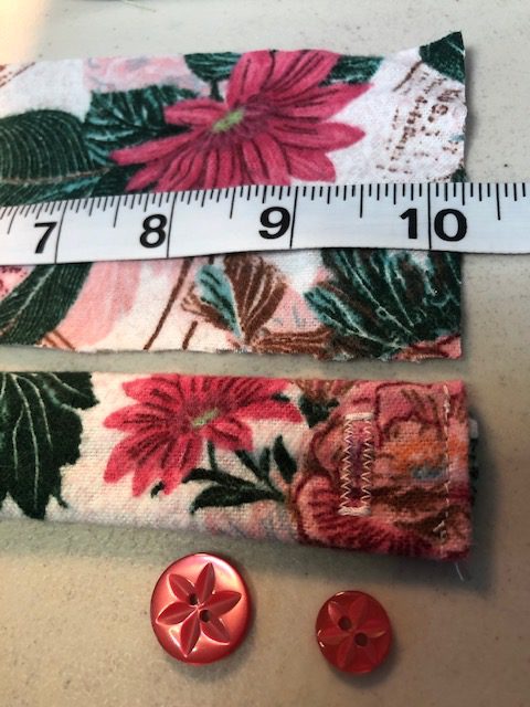 As far as the buttons go, my button foot will also sew buttons on for you but I don’t trust it, lol. I handsewed all 8 on. All 8! It made me wonder how seamstresses who sew all those buttons on the back of a wedding gown do it. Talk about a lot of concentration and hand coordination. I actually finished early in the day so I decided to create a matching scrunchie using the leftover piping and flannel.