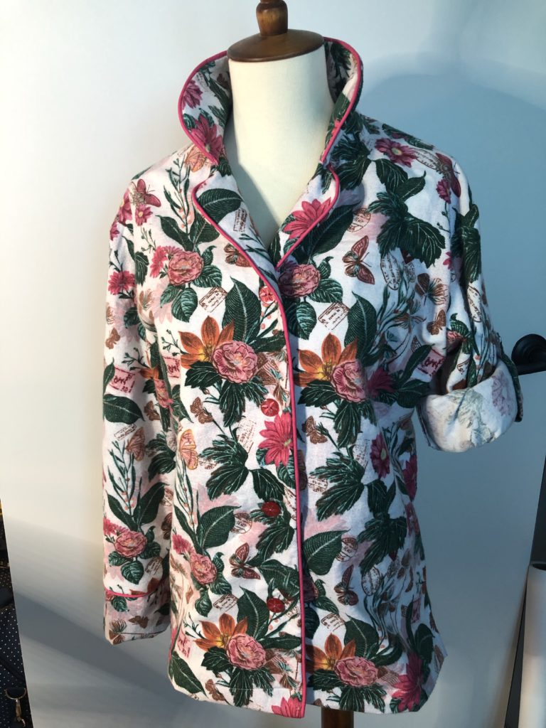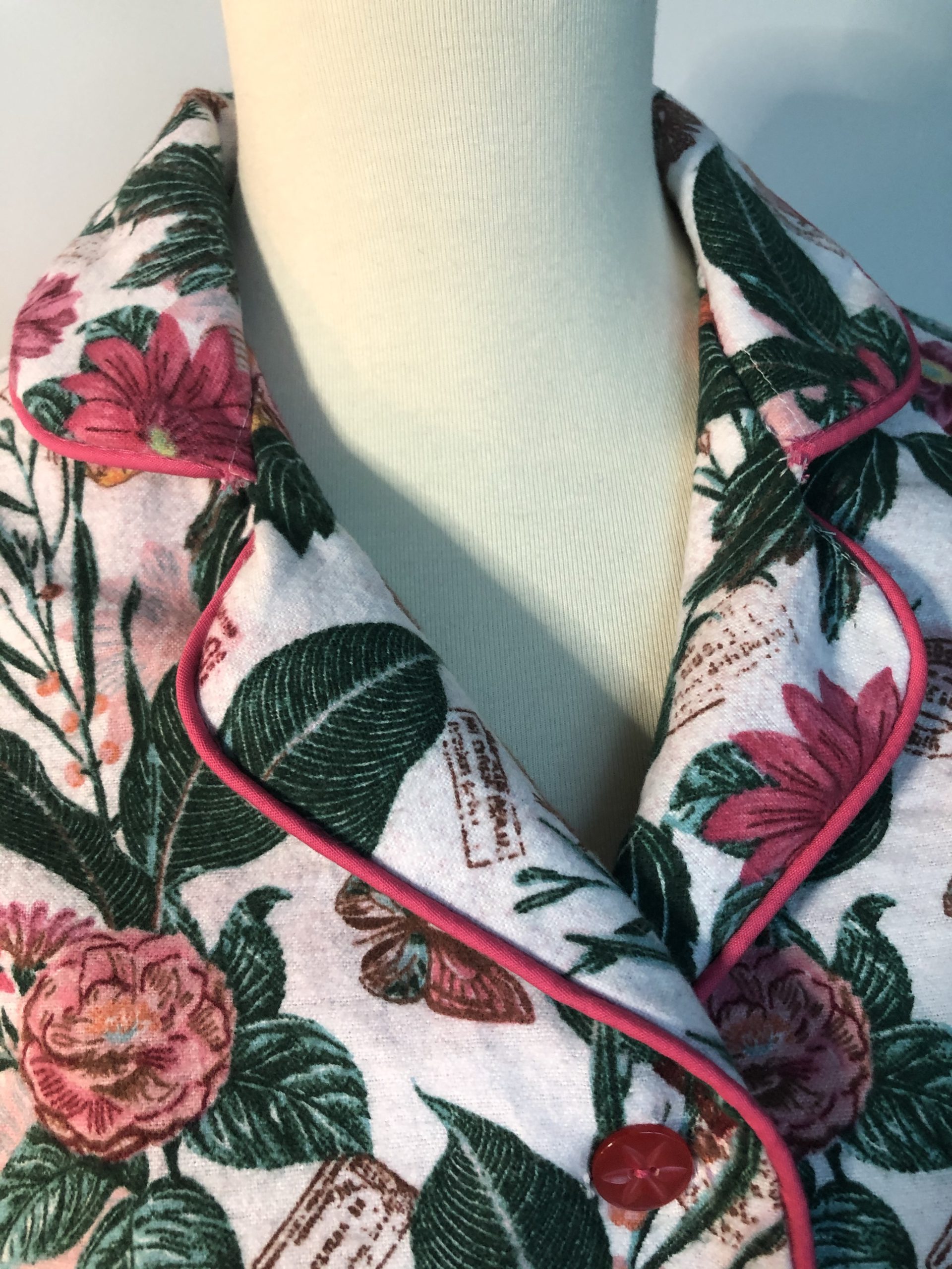 I wear flannels year round but can never find summer flannel pjs in RTW. The stores almost always switch over to shorts and tank tops once summer hits. Flannel seems to be reserved for Christmas for some reason. I chose this bright and happy floral from my fabric stash that I got on super clearance last summer. I just love the hot pink! I decided to highlight that color and use it in the piping and buttons.