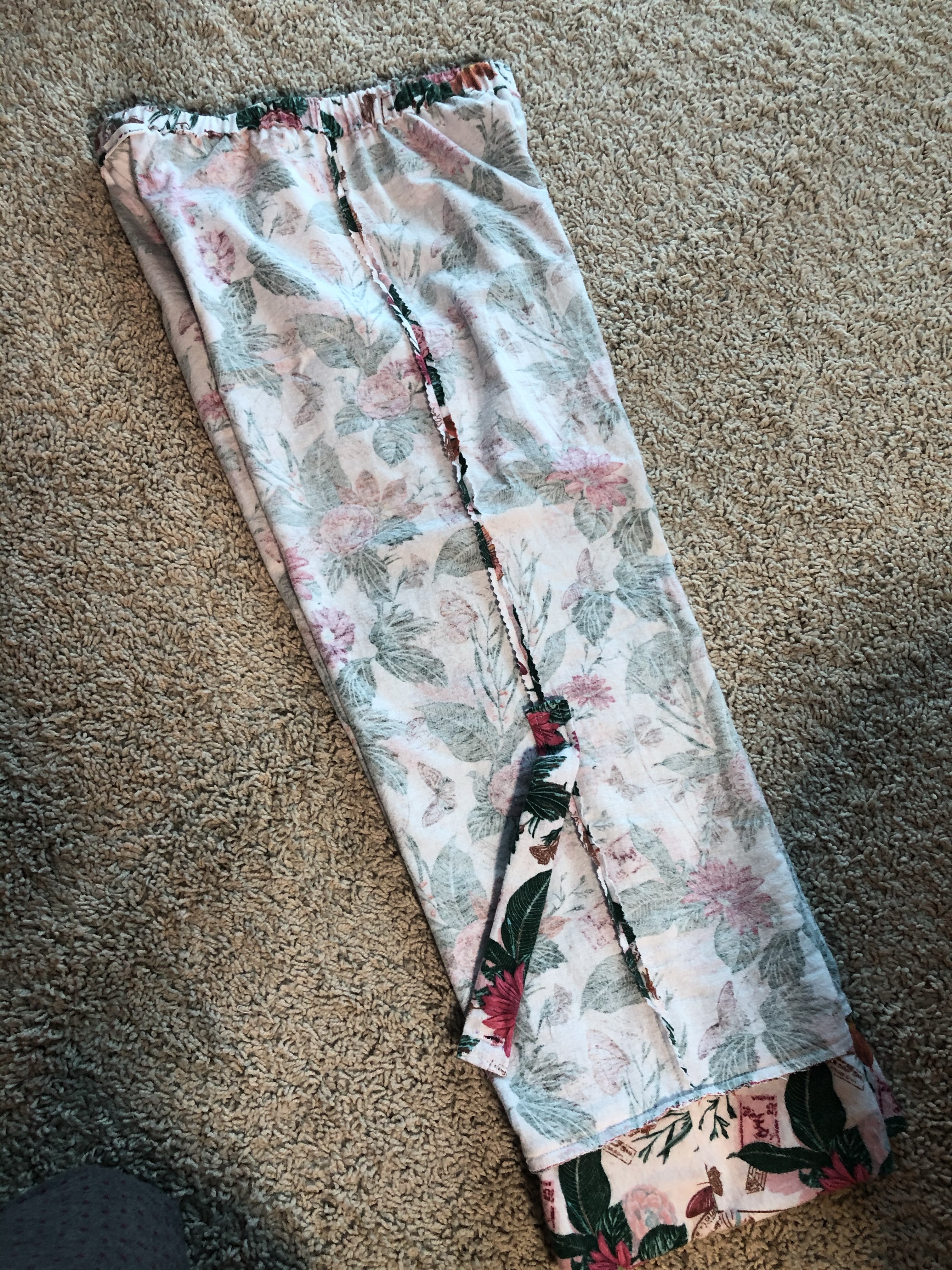 Since I’ve made pj pants before, I decided to tackle the pants first. I was able to get these done on Days 1 and 2. Instructions were the same as all the other patterns I’ve sewn. Insert one leg into the other, turn inside out and ta-da! Pants. I had to chop off 4.5″ in the length since this pant as a cuff.