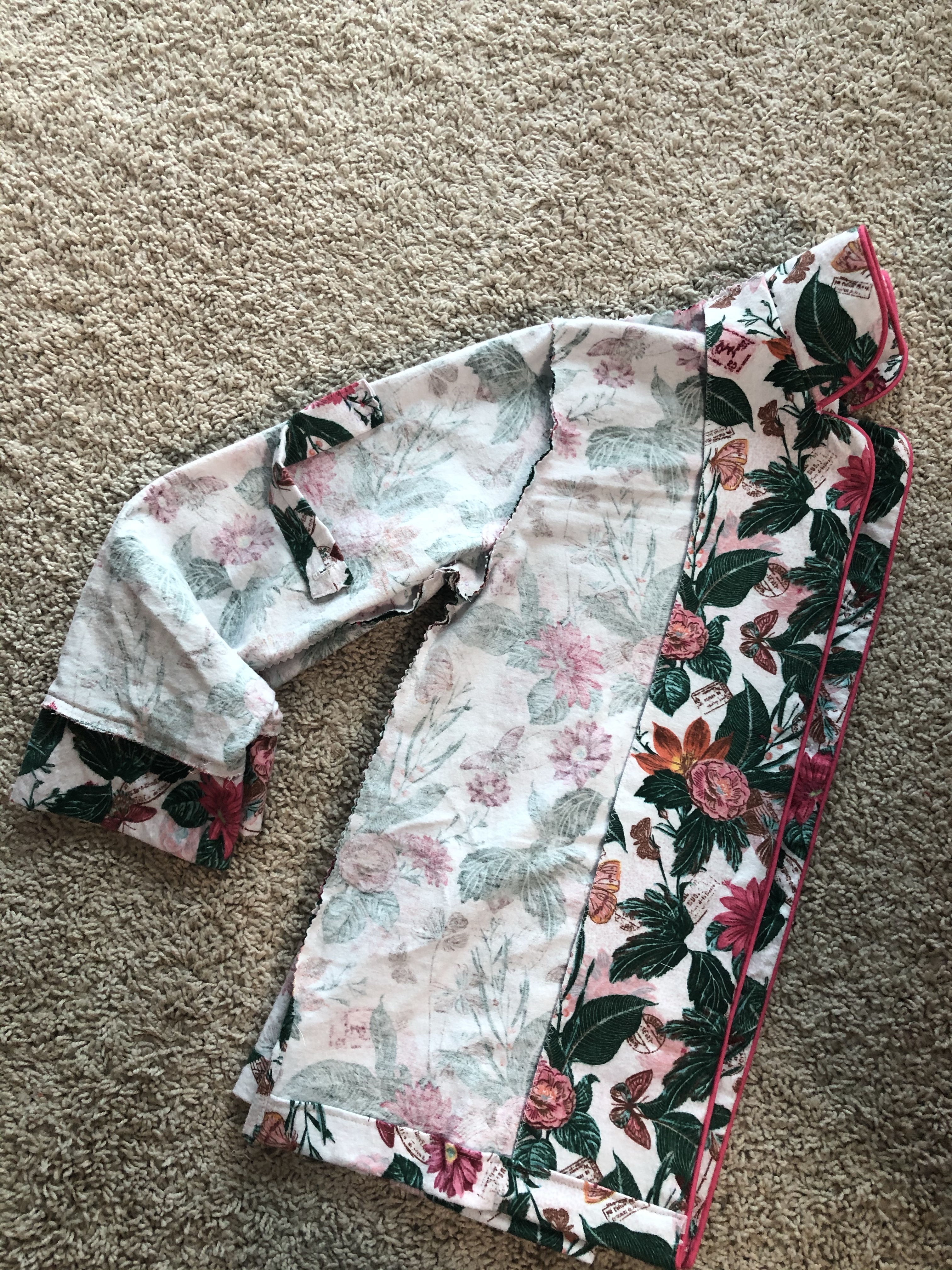 For the contest we had to incorporate something that made the pjs unique to you. I thought about my day and what would be helpful. I do a lot of chores in the mornings and am usually still wearing pjs. I decided to create roll tabs for the arms and legs since I normally roll them up once I get in the zone aka doped up on coffee. They never stay up though and it’s really irritating when you’re trying to wash the dishes and they creep back down and get wet. The tabs would help keep them up. I figured why stop at the arms?! Let’s make tabs for the legs too since I hate getting pant legs wet when cleaning the shower.