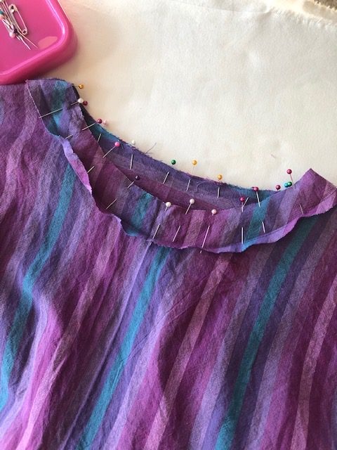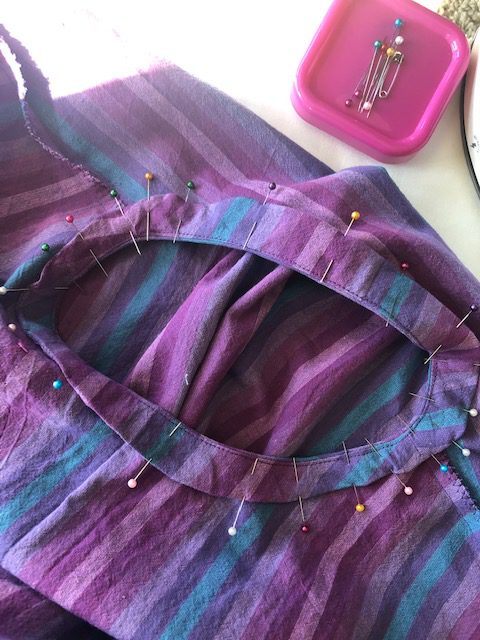 The dress has self-neck facing so you don’t have to worry about a stretched out neckline. The instructions say to stitch at 1/4″ then use that as a guide for pressing then attach the facing to the neckline. This was probably the hardest part for me, trying to keep everything flat. I opted out of using interfacing.