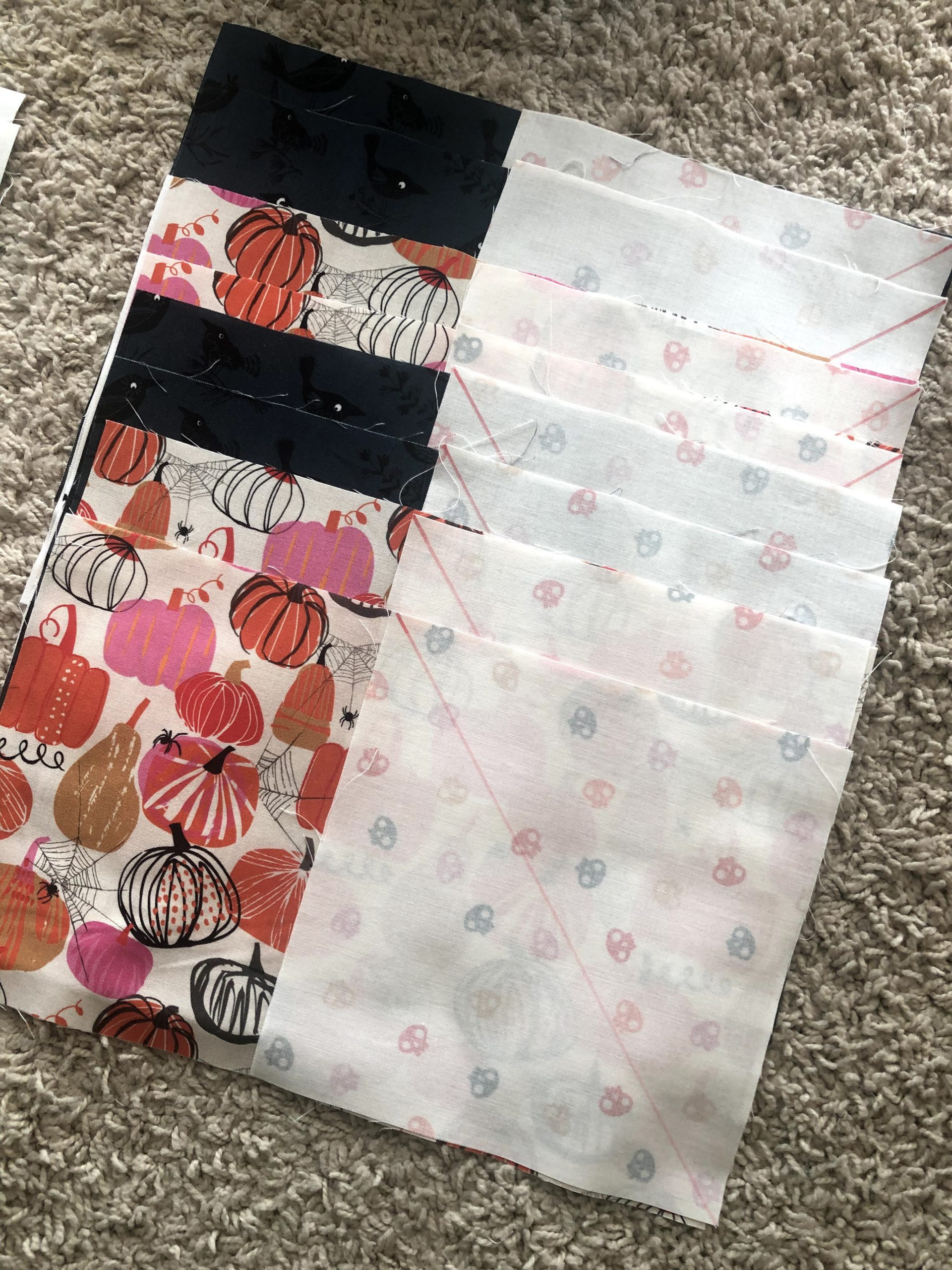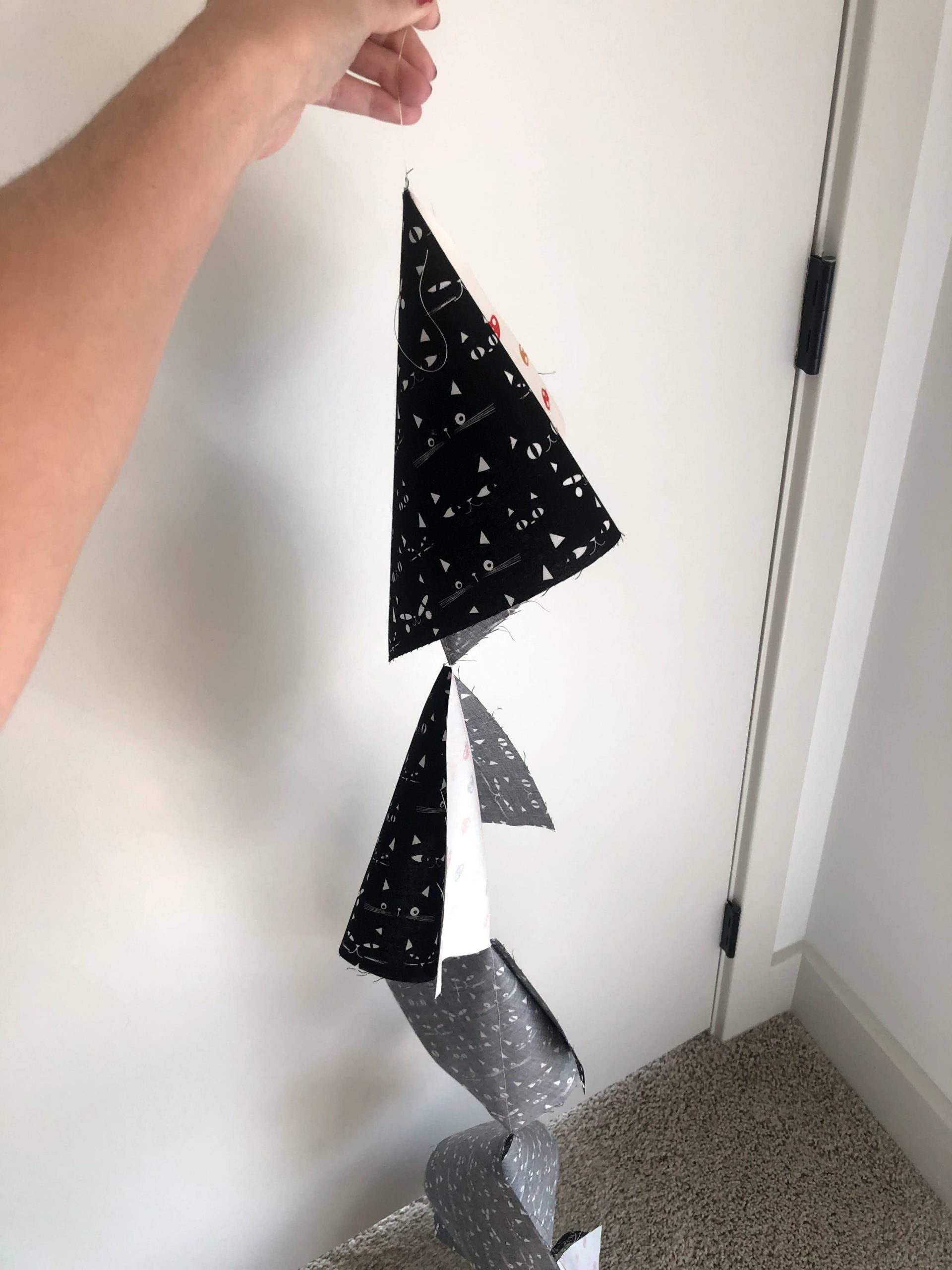 3. Chain piecing. I learned this about halfway though! Yes, I painstakingly sewed each triangle one by one. But with chain piecing you keep sewing and literally sew a chain in between each triangle piece. I was hesitant to do this since I had read you shouldn’t let your sewing machine just sew on top of nothing- but boy did this save a lot of time! Plus there is something extremely satisfying when you cut between each piece! It’s like cutting sausage links, lol.