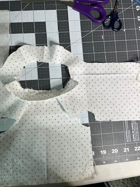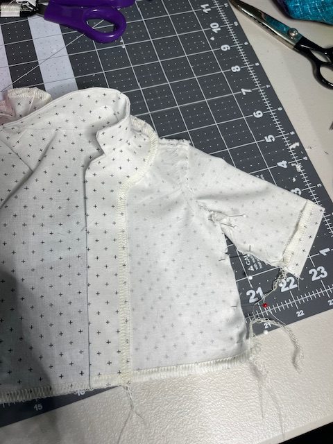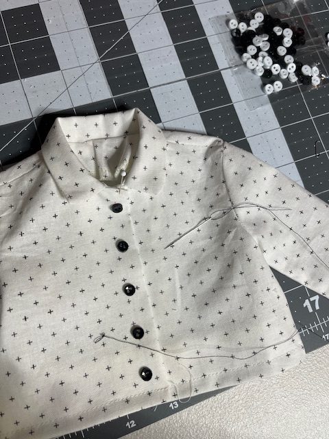 The pattern uses real buttons and buttonholes but I opted for the usual velcro. More hand sewing for those microbuttons! Pia really likes putting me to work! The shirt turned out boxy having hemmed it 1″ instead of 1/2″.