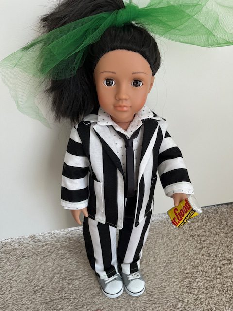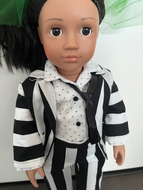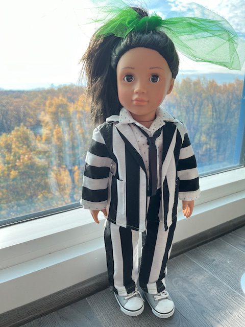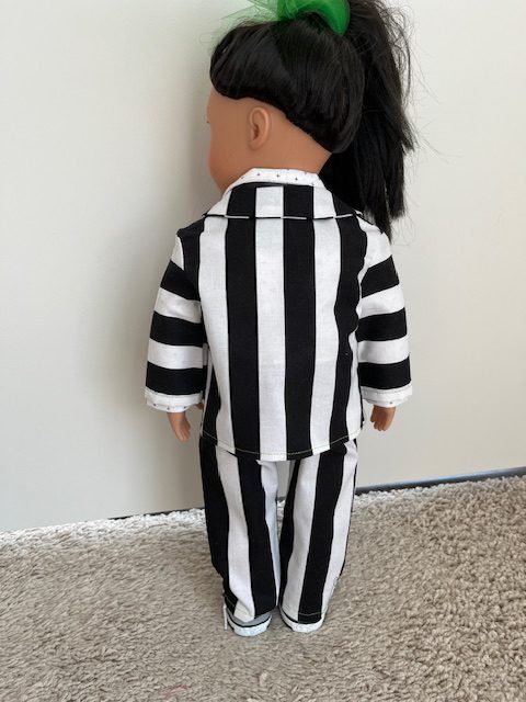 Last minute decision to tie green tulle in her hair as a final touch. This Beetlejuice costume was a lot more work than I had anticipated but I think Pia looks great! I admit I’m pretty proud of my pattern match on her collar and invisible pockets, lol. She loves the real pockets to stash some candy.