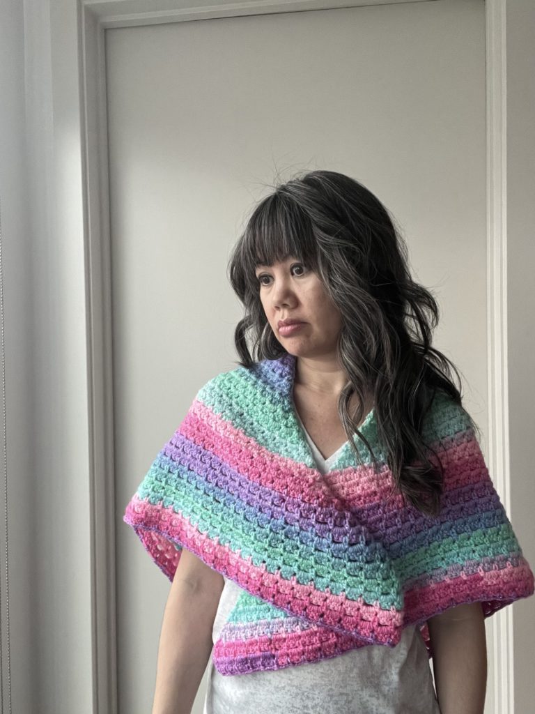 Does it fulfill all my hopes AND dreams??! That’s a stretch, lol. I’m sticking to the rectangular blanket style wraps next time. The pattern is great though, especially the instruction. So If it fulfills all your hopes and dreams I recommend giving this pattern a whirl!