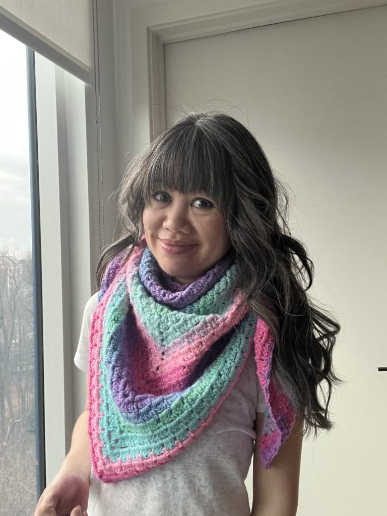 Would I make this again? Probably not. I’ve decided I don’t like triangle shawls. I am having the hardest time styling this thing.