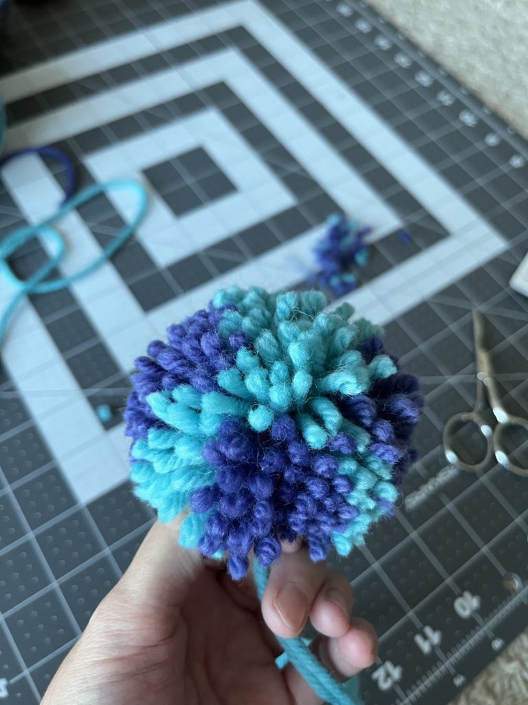 It definitely needed a pom-pom so I used a 2.5″ Clover pom-pom maker. This made my life easier and it was so easy to use. Clover has never let me down! I could probably go up in size next time. You really don’t need a special tool to make a pom-pom though. Cardboard can do the same thing.