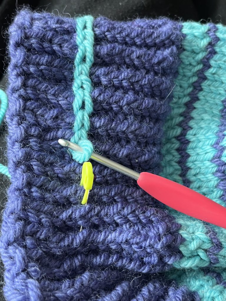 The headband look was really eating away at me so I tried doing a chain surface crochet stitch to break up some of that dark blue. The stitches made the hat too tight and wouldn’t stretch anymore. My solution was to finish the edge with a line of single crochet. I think it looks better. Anything to make it look proportioned!