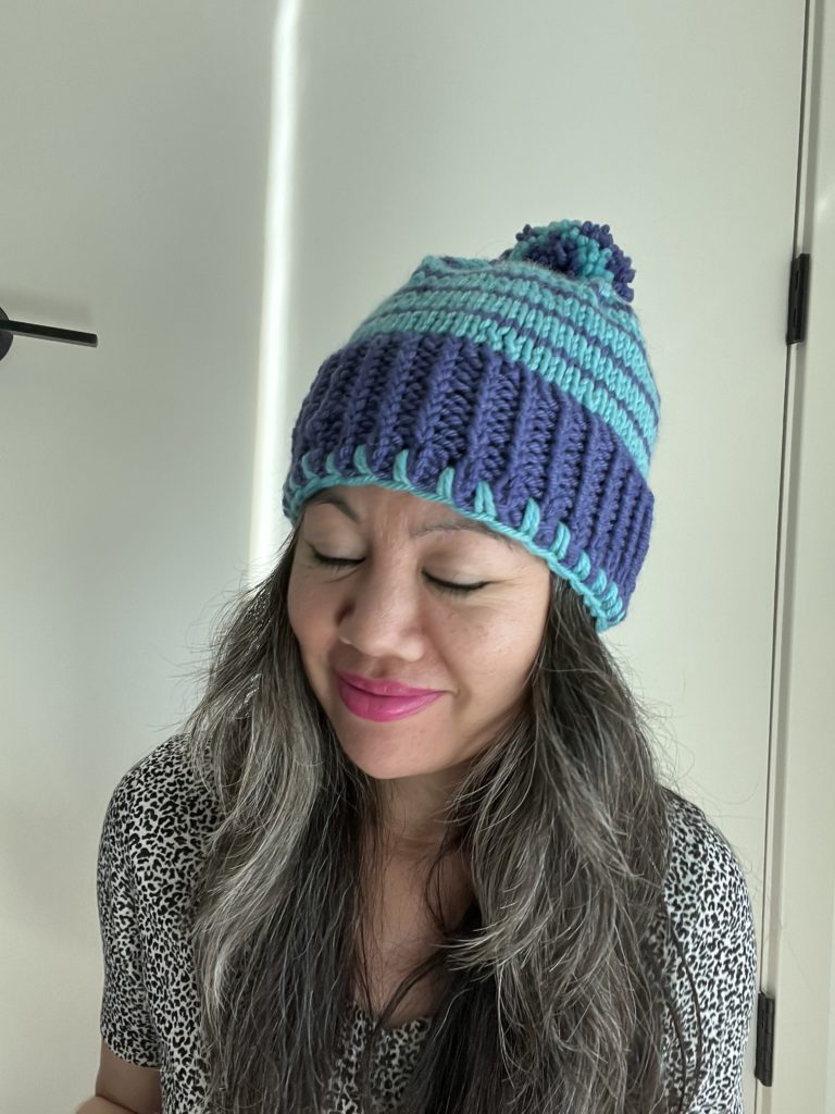 The pattern has a 4″ folded brim but I deviated and made the brim 3″. I wanted the focus to be on the contrasting stripes and was going more for a skull cap fit. Next time I will make it only 1 inch. At 3″ it is not proportioned and looks too headband-ish. Plus I can hardly see the stripes, and that’s my favorite part! I really don’t know why I didn’t try it on while knitting it to make sure it was to my liking. I do this all the time with sewing. Fit is key! Rookie mistake. Alas, next time.