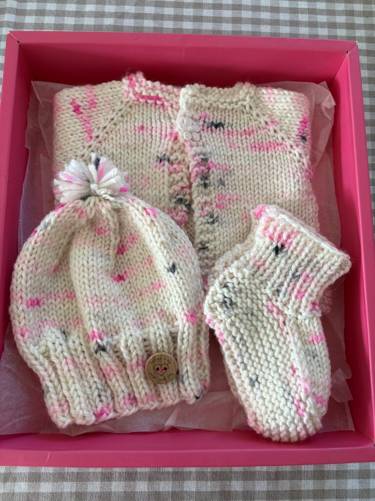 I love my niece so much! I am passing the torch to her being the only girl in our family for a very long time. (I was the last one.) I knitted this little set for her….first time making baby anything. It’s so stinking cute I want to cry!